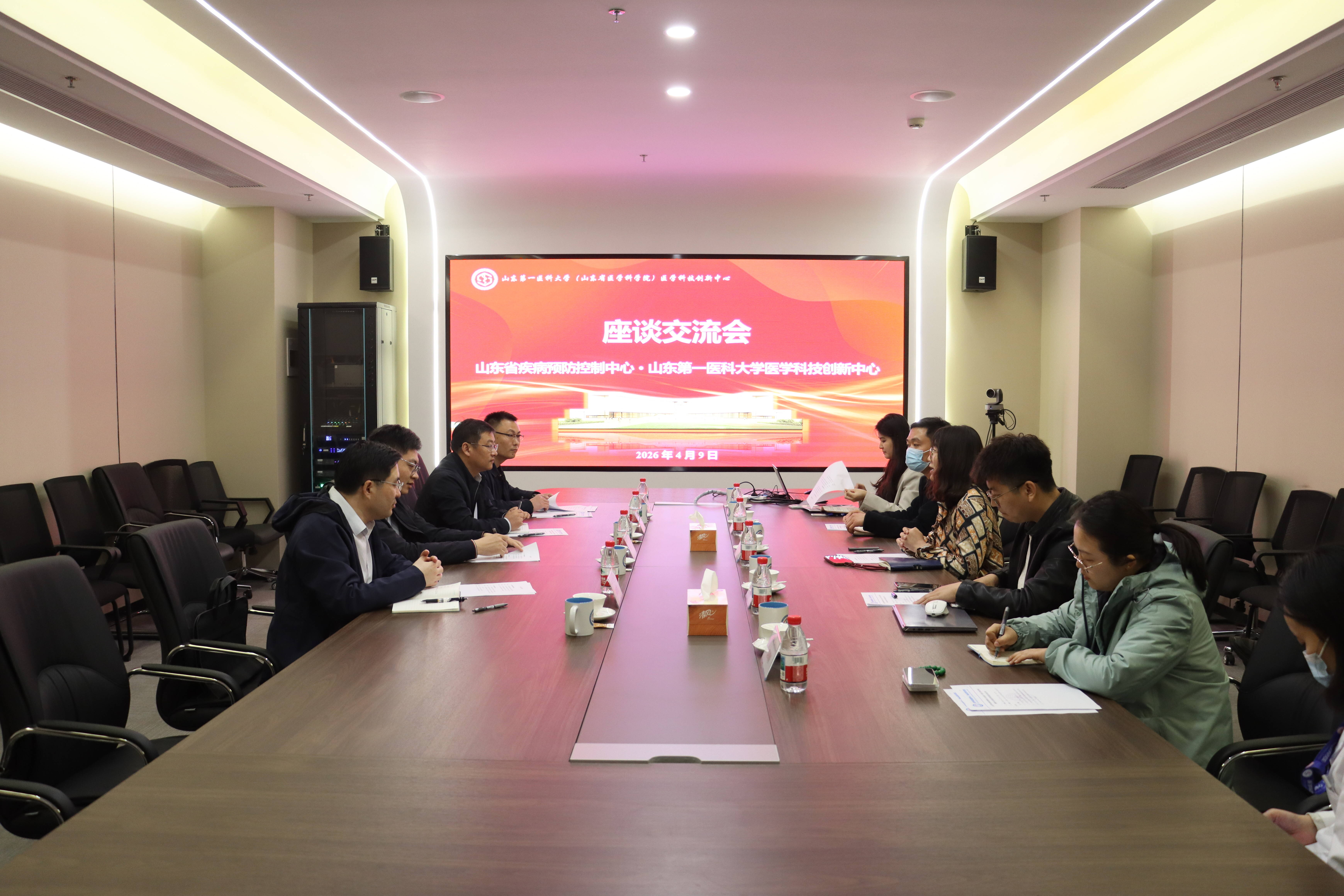 4月9日,山东省疾病预防控制中心党委委员、副主任姜晓林,徐希柱一行到校(院)医学科技创新中心(简称“科创中心”)访问并进行座谈交流。科创中心常务副主任辛玮出席活动。